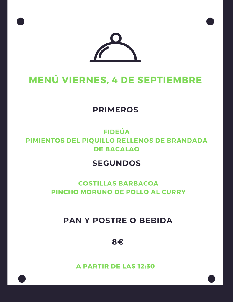Menú viernes, 4 de septiembre septiembre 3, 2020 de Tu Puchero Deja un comentario Comparte esto: Compartir en X (Se abre en una ventana nueva) X Compartir en Facebook (Se abre en una ventana nueva) Facebook Más Compartir en WhatsApp (Se abre en una ventana nueva) WhatsApp Me gusta Cargando...