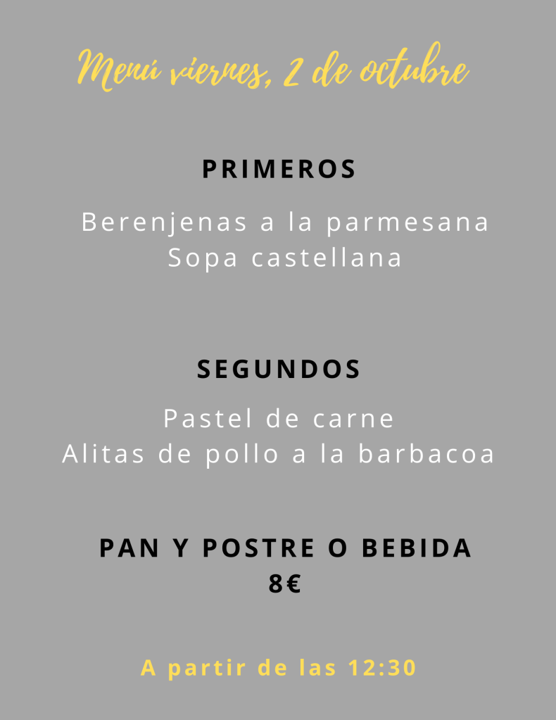 Menú viernes, 2 de octubre octubre 1, 2020 de Tu Puchero Deja un comentario Comparte esto: Compartir en X (Se abre en una ventana nueva) X Compartir en Facebook (Se abre en una ventana nueva) Facebook Más Compartir en WhatsApp (Se abre en una ventana nueva) WhatsApp Me gusta Cargando...