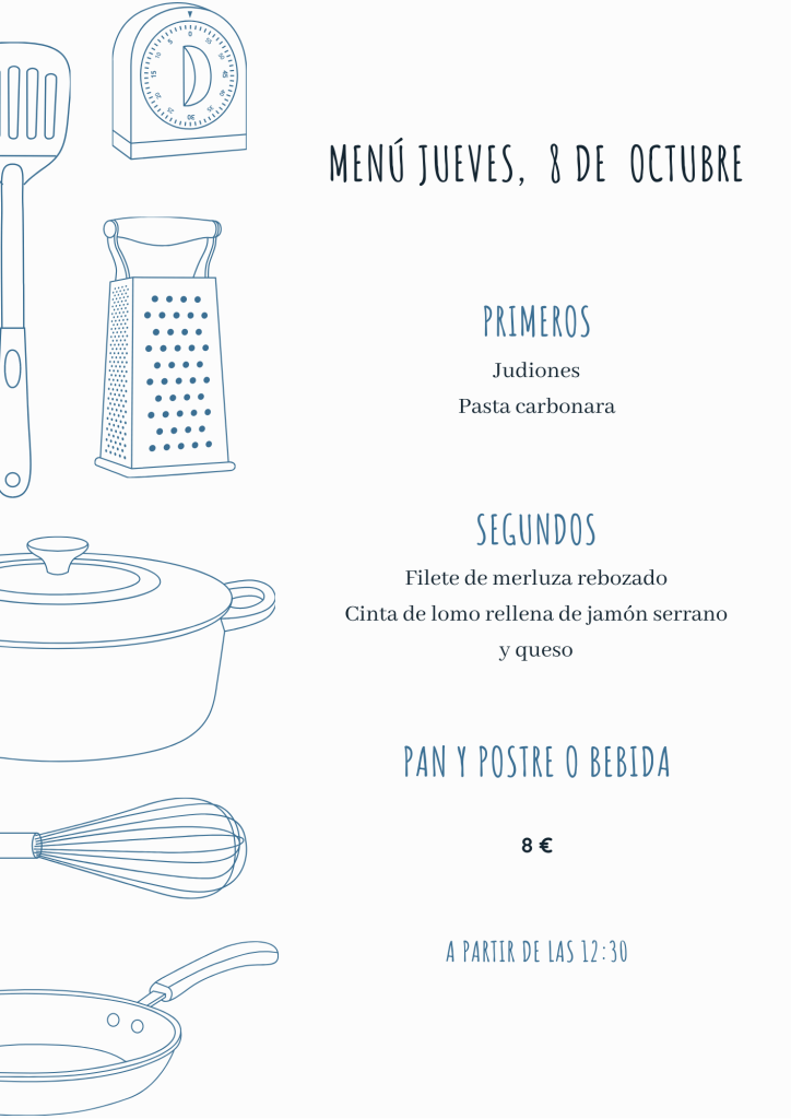 Menú jueves, 8 de octubre octubre 7, 2020 de Tu Puchero Deja un comentario Comparte esto: Compartir en X (Se abre en una ventana nueva) X Compartir en Facebook (Se abre en una ventana nueva) Facebook Más Compartir en WhatsApp (Se abre en una ventana nueva) WhatsApp Me gusta Cargando...