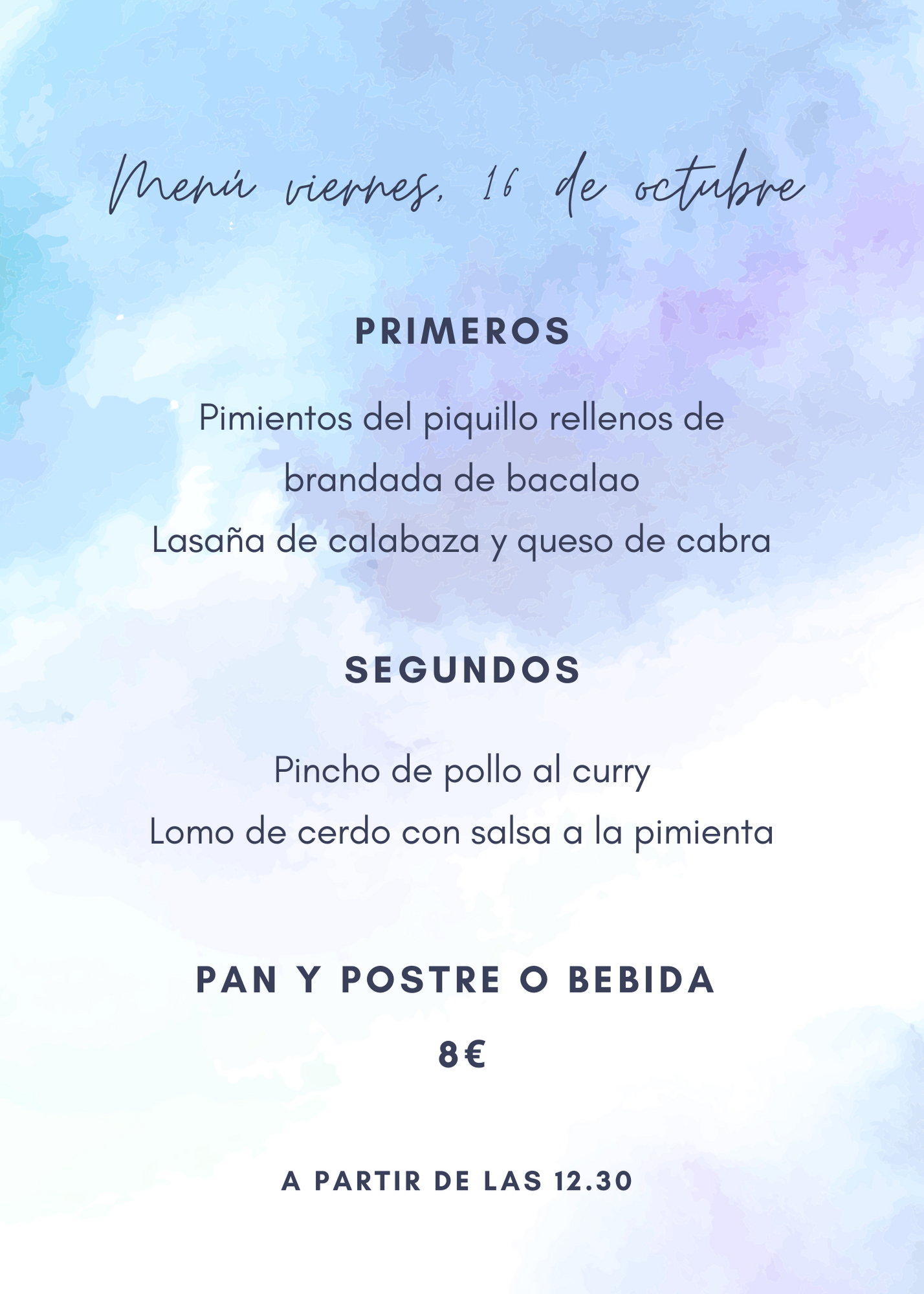 Menú viernes, 16 de octubre octubre 15, 2020 de Tu Puchero Deja un comentario Comparte esto: Compartir en X (Se abre en una ventana nueva) X Compartir en Facebook (Se abre en una ventana nueva) Facebook Más Compartir en WhatsApp (Se abre en una ventana nueva) WhatsApp Me gusta Cargando...