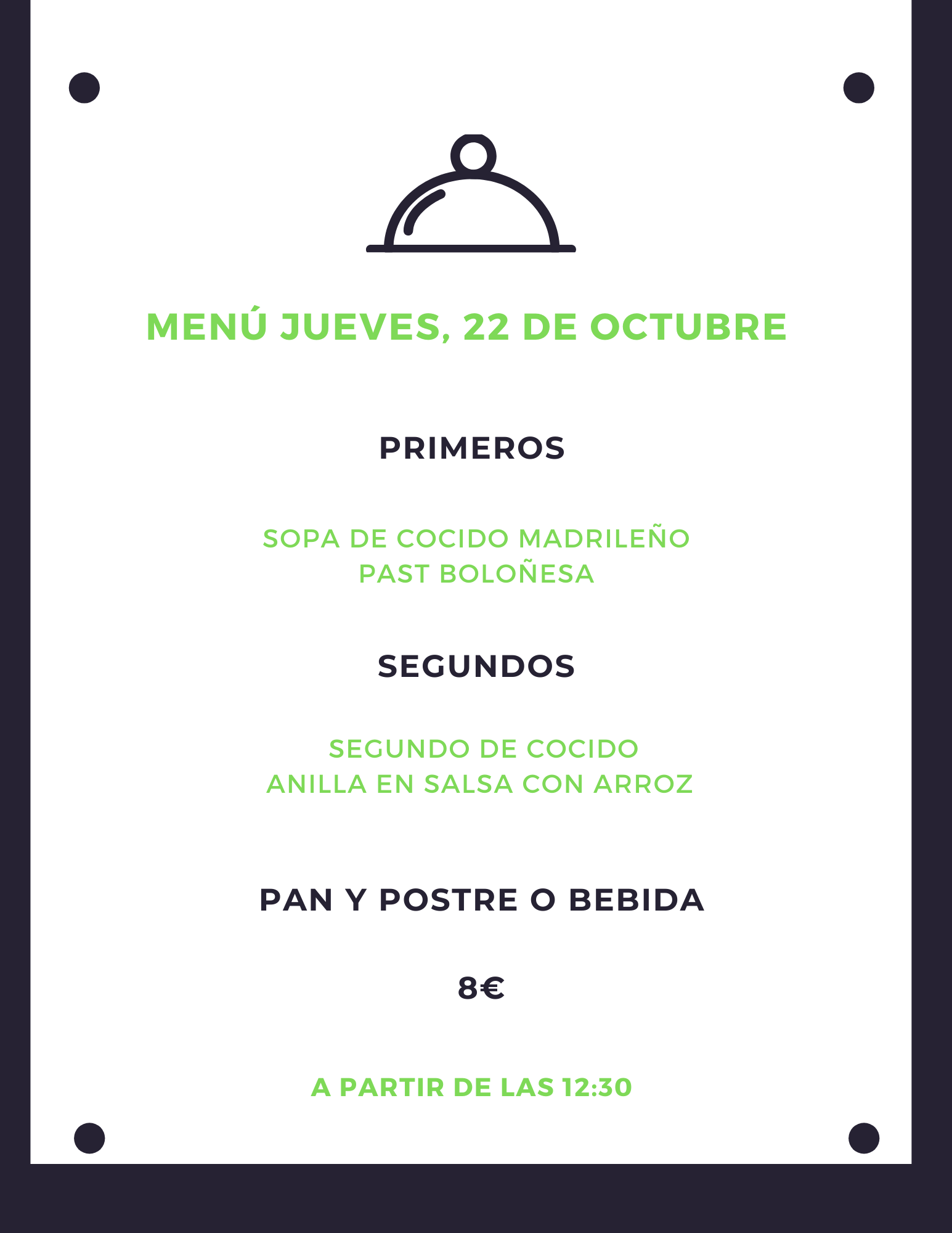 Menú jueves, 22 de octubre octubre 21, 2020 de Tu Puchero Deja un comentario Comparte esto: Compartir en X (Se abre en una ventana nueva) X Compartir en Facebook (Se abre en una ventana nueva) Facebook Más Compartir en WhatsApp (Se abre en una ventana nueva) WhatsApp Me gusta Cargando...
