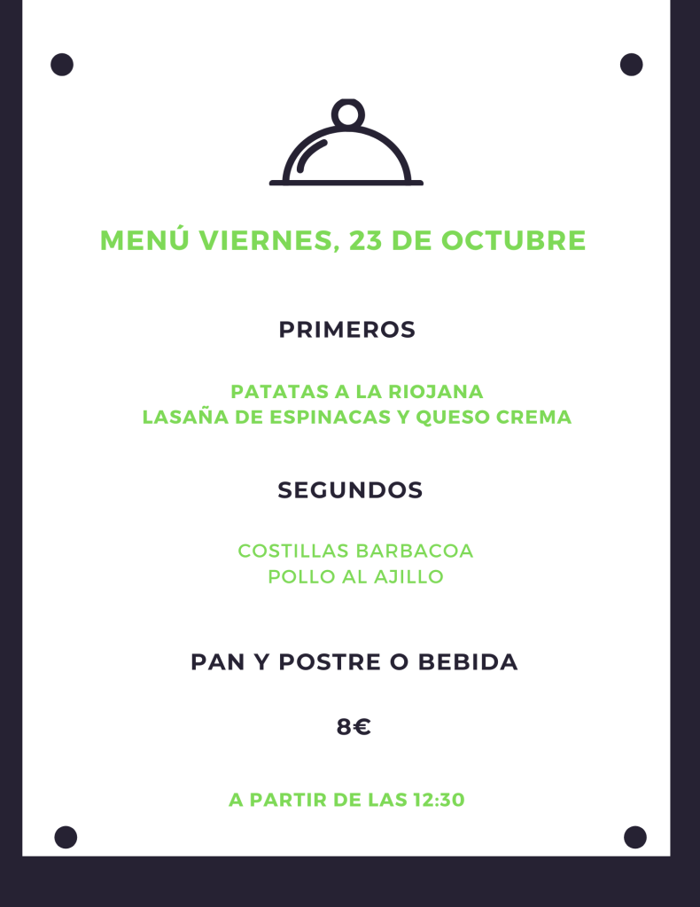 Menú viernes, 23 de octubre octubre 22, 2020 de Tu Puchero Deja un comentario Comparte esto: Compartir en X (Se abre en una ventana nueva) X Compartir en Facebook (Se abre en una ventana nueva) Facebook Más Compartir en WhatsApp (Se abre en una ventana nueva) WhatsApp Me gusta Cargando...