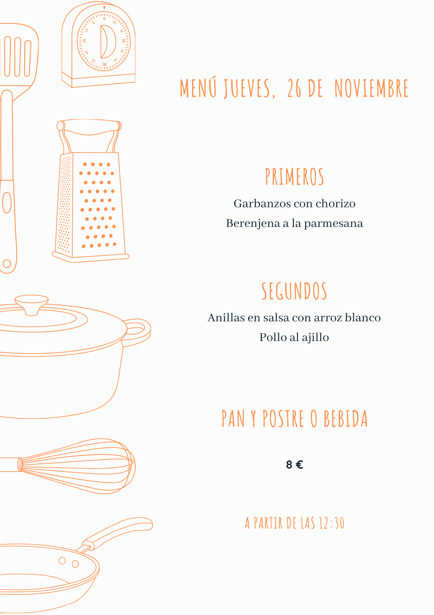 Menú jueves, 26 de noviembre noviembre 25, 2020 de Tu Puchero Deja un comentario Comparte esto: Compartir en X (Se abre en una ventana nueva) X Compartir en Facebook (Se abre en una ventana nueva) Facebook Más Compartir en WhatsApp (Se abre en una ventana nueva) WhatsApp Me gusta Cargando...