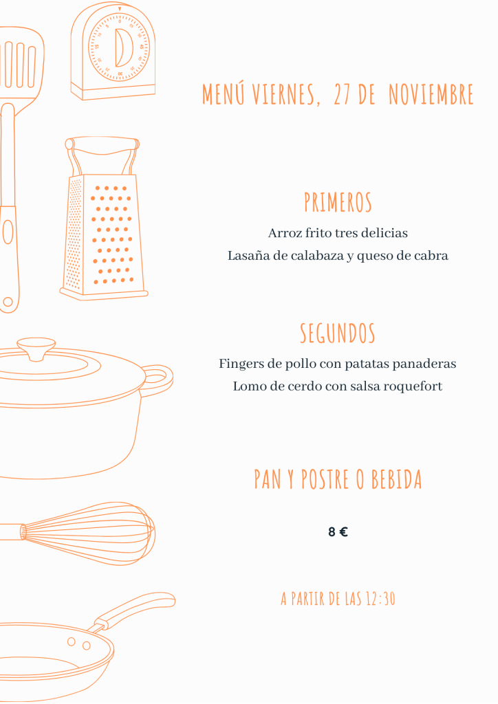 Menú viernes, 27 de noviembre noviembre 26, 2020 de Tu Puchero Deja un comentario Comparte esto: Compartir en X (Se abre en una ventana nueva) X Compartir en Facebook (Se abre en una ventana nueva) Facebook Más Compartir en WhatsApp (Se abre en una ventana nueva) WhatsApp Me gusta Cargando...