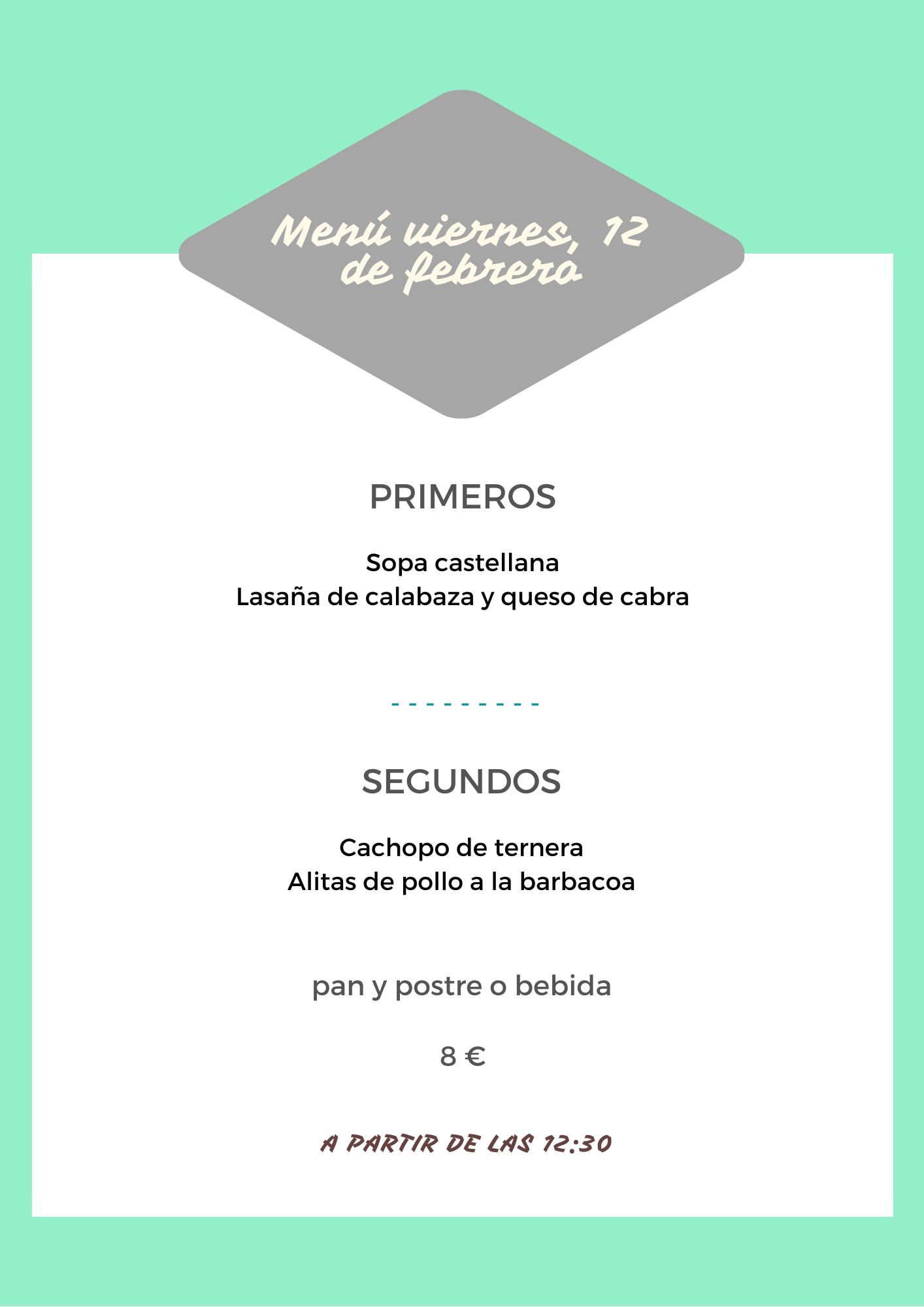 Menú viernes, 12 de febrero febrero 11, 2021 de Tu Puchero Deja un comentario Comparte esto: Compartir en X (Se abre en una ventana nueva) X Compartir en Facebook (Se abre en una ventana nueva) Facebook Más Compartir en WhatsApp (Se abre en una ventana nueva) WhatsApp Me gusta Cargando...