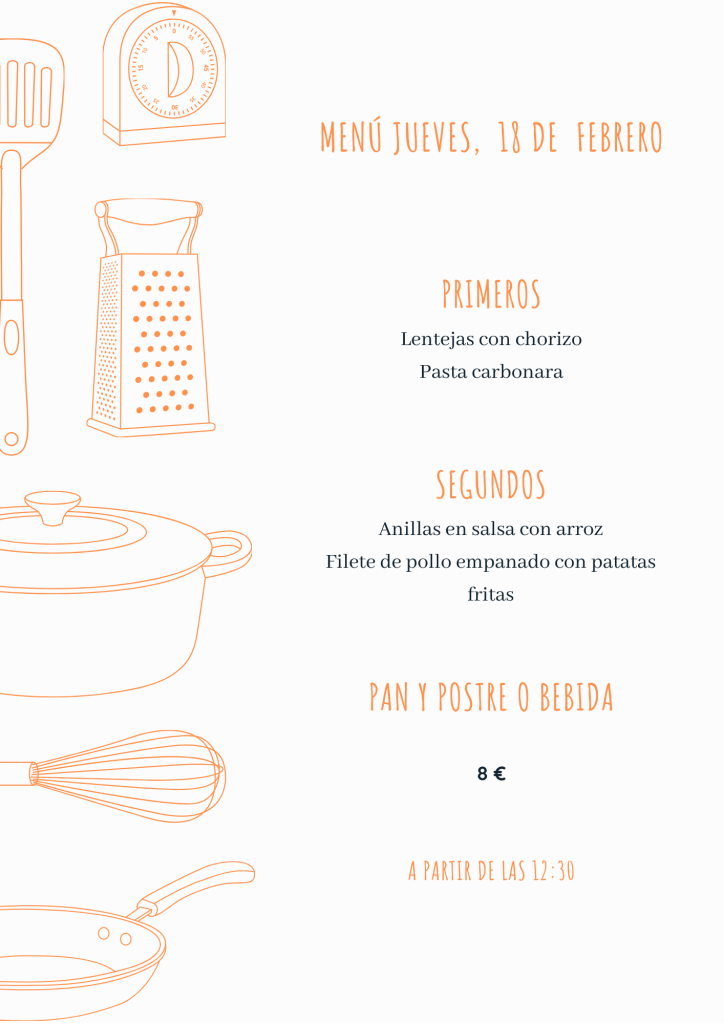 Menú jueves, 18 de febrero febrero 17, 2021 de Tu Puchero Deja un comentario Comparte esto: Compartir en X (Se abre en una ventana nueva) X Compartir en Facebook (Se abre en una ventana nueva) Facebook Más Compartir en WhatsApp (Se abre en una ventana nueva) WhatsApp Me gusta Cargando...