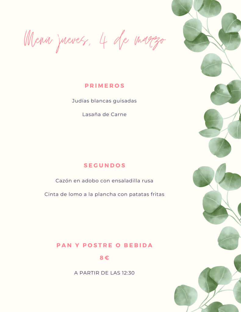 Menú jueves, 4 de marzo marzo 3, 2021 de Tu Puchero Deja un comentario Comparte esto: Compartir en X (Se abre en una ventana nueva) X Compartir en Facebook (Se abre en una ventana nueva) Facebook Más Compartir en WhatsApp (Se abre en una ventana nueva) WhatsApp Me gusta Cargando...