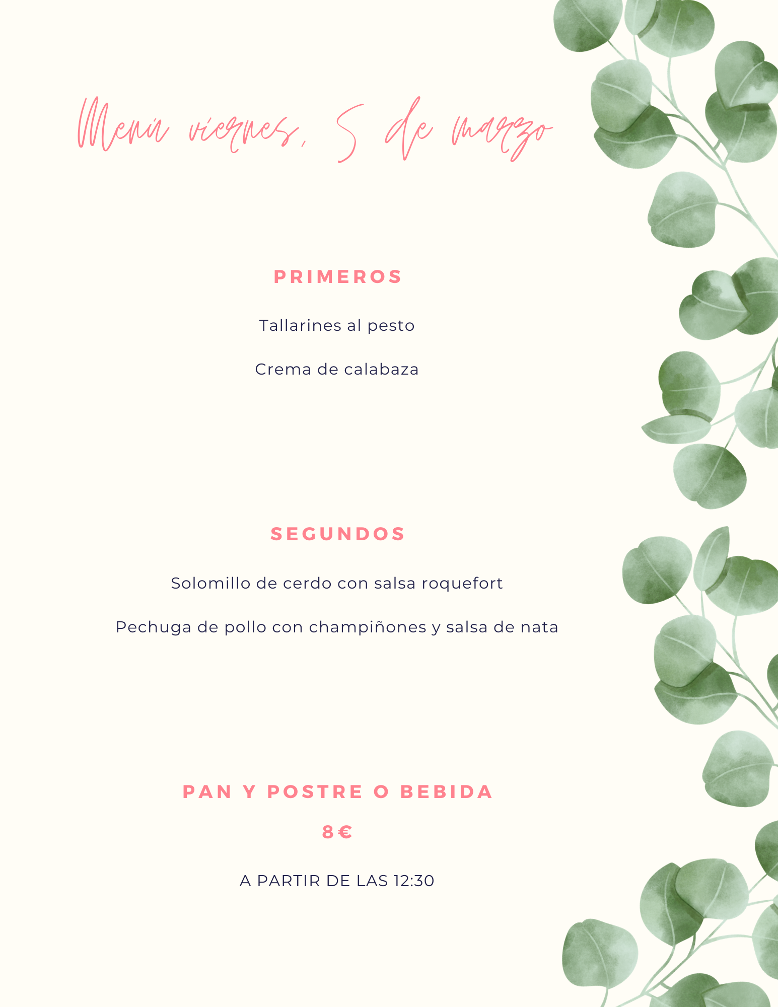 Menú viernes, 5 de marzo marzo 4, 2021 de Tu Puchero Deja un comentario Comparte esto: Compartir en X (Se abre en una ventana nueva) X Compartir en Facebook (Se abre en una ventana nueva) Facebook Más Compartir en WhatsApp (Se abre en una ventana nueva) WhatsApp Me gusta Cargando...