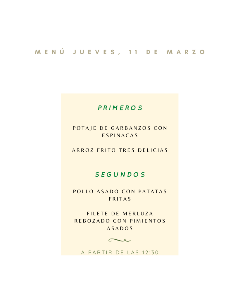 Menú jueves, 11 de marzo marzo 10, 2021 de Tu Puchero Deja un comentario Comparte esto: Compartir en X (Se abre en una ventana nueva) X Compartir en Facebook (Se abre en una ventana nueva) Facebook Más Compartir en WhatsApp (Se abre en una ventana nueva) WhatsApp Me gusta Cargando...