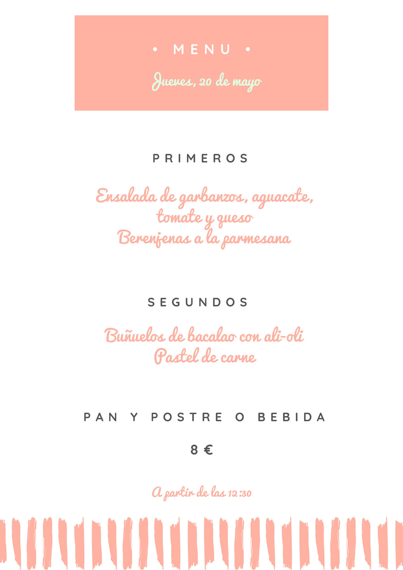 Menú jueves, 20 de mayo mayo 19, 2021 de Tu Puchero Deja un comentario Comparte esto: Compartir en X (Se abre en una ventana nueva) X Compartir en Facebook (Se abre en una ventana nueva) Facebook Más Compartir en WhatsApp (Se abre en una ventana nueva) WhatsApp Me gusta Cargando...