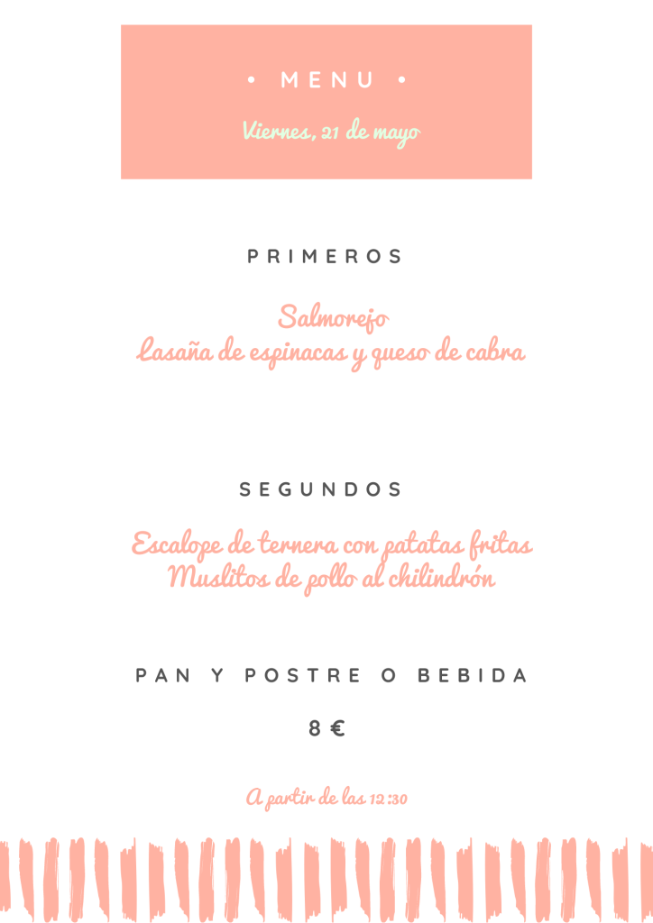Menú viernes, 21 de mayo mayo 20, 2021 de Tu Puchero Deja un comentario Comparte esto: Compartir en X (Se abre en una ventana nueva) X Compartir en Facebook (Se abre en una ventana nueva) Facebook Más Compartir en WhatsApp (Se abre en una ventana nueva) WhatsApp Me gusta Cargando...