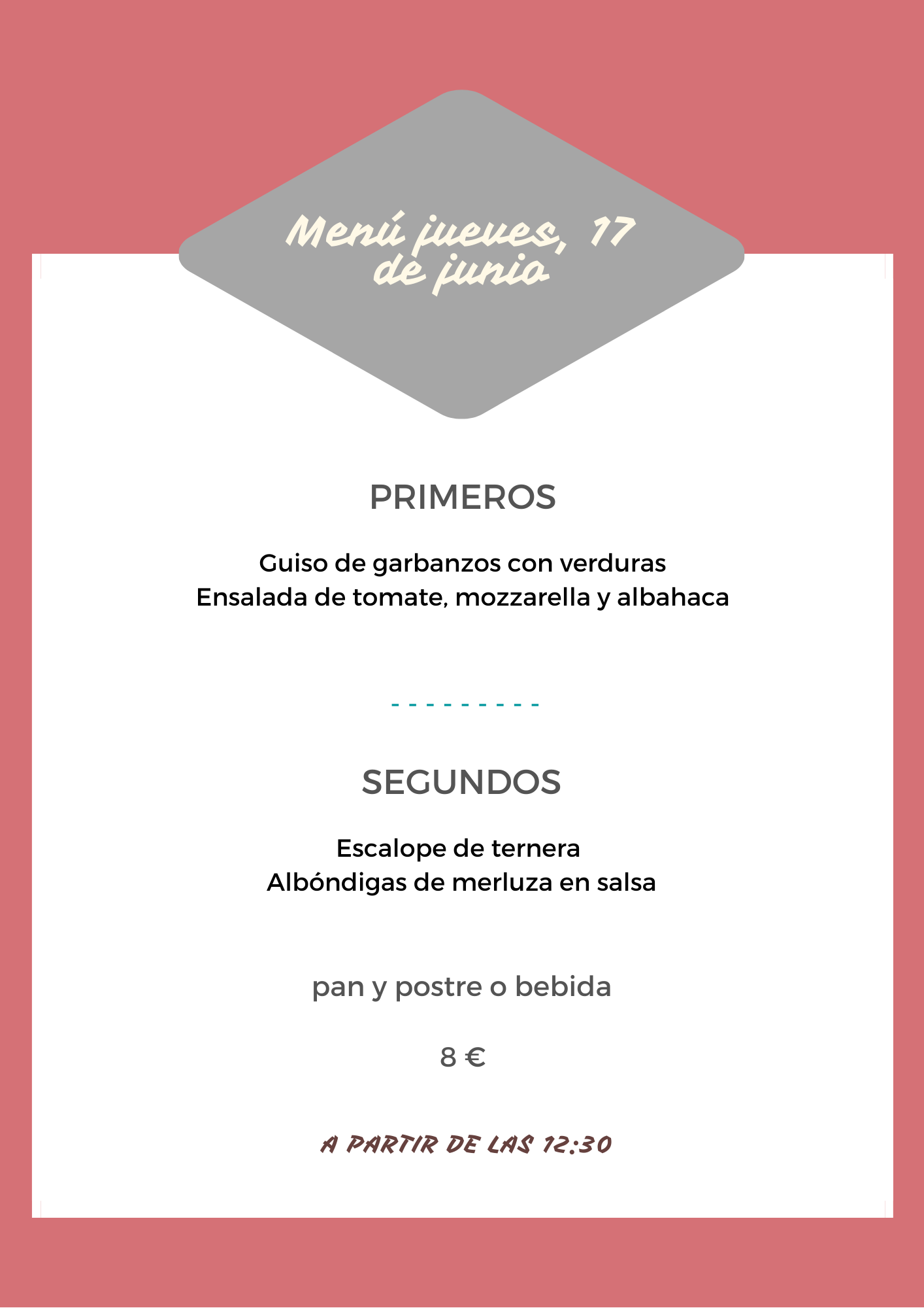 Menú jueves, 17 de junio junio 16, 2021 de Tu Puchero Deja un comentario Comparte esto: Compartir en X (Se abre en una ventana nueva) X Compartir en Facebook (Se abre en una ventana nueva) Facebook Más Compartir en WhatsApp (Se abre en una ventana nueva) WhatsApp Me gusta Cargando...