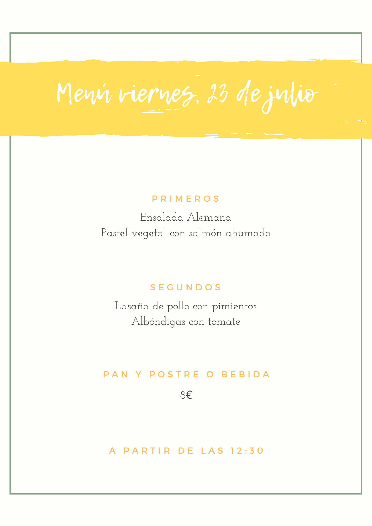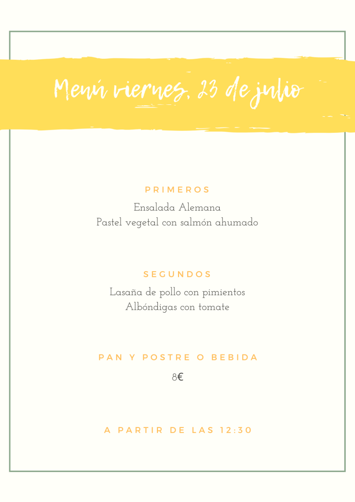 Menú viernes, 23 de julio julio 22, 2021 de Tu Puchero Deja un comentario Comparte esto: Compartir en X (Se abre en una ventana nueva) X Compartir en Facebook (Se abre en una ventana nueva) Facebook Más Compartir en WhatsApp (Se abre en una ventana nueva) WhatsApp Me gusta Cargando...