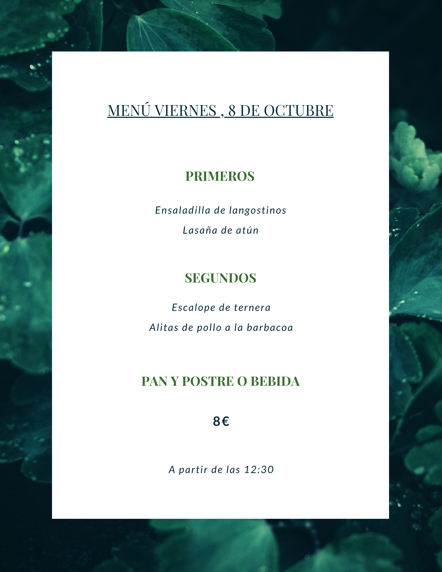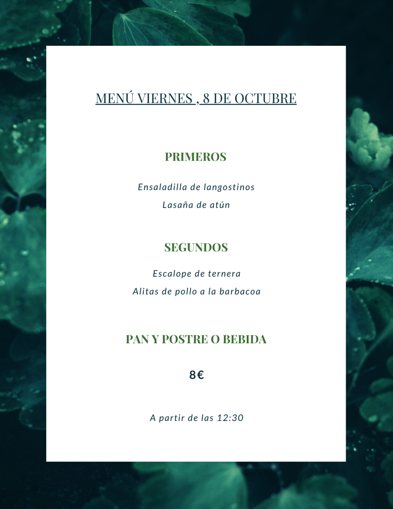 Menú viernes, 8 de octubre octubre 7, 2021 de Tu Puchero Deja un comentario Comparte esto: Compartir en X (Se abre en una ventana nueva) X Compartir en Facebook (Se abre en una ventana nueva) Facebook Más Compartir en WhatsApp (Se abre en una ventana nueva) WhatsApp Me gusta Cargando...