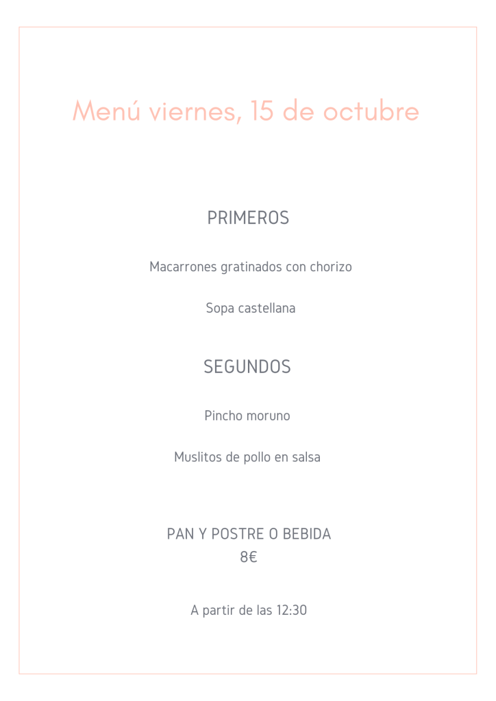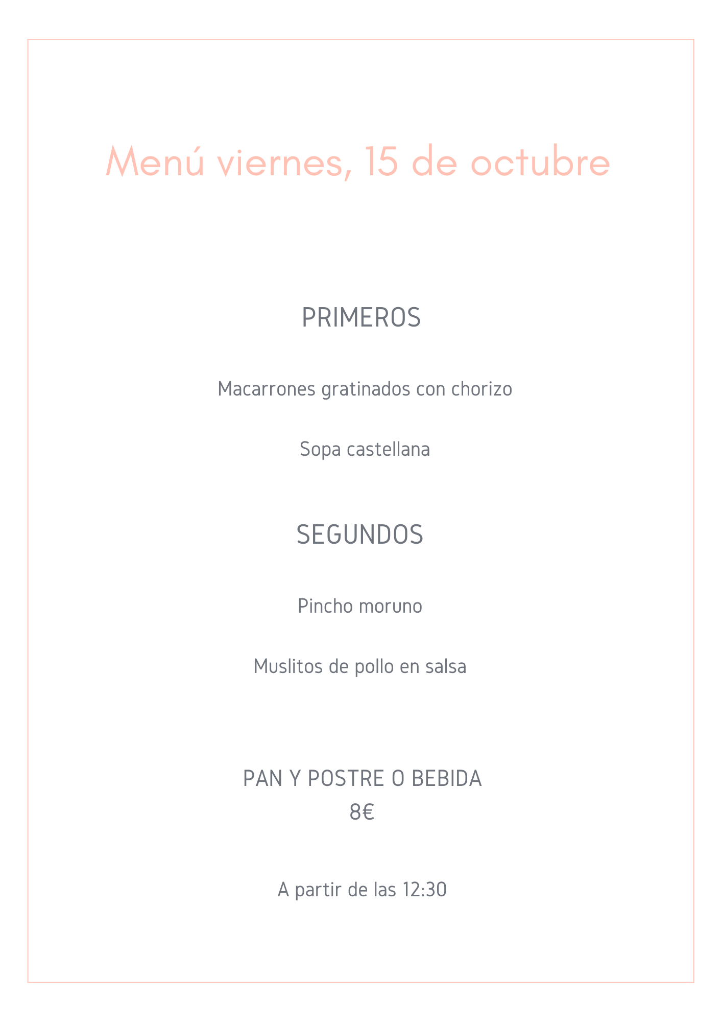 Menú viernes, 15 de octubre octubre 14, 2021 de Tu Puchero Deja un comentario Comparte esto: Compartir en X (Se abre en una ventana nueva) X Compartir en Facebook (Se abre en una ventana nueva) Facebook Más Compartir en WhatsApp (Se abre en una ventana nueva) WhatsApp Me gusta Cargando...