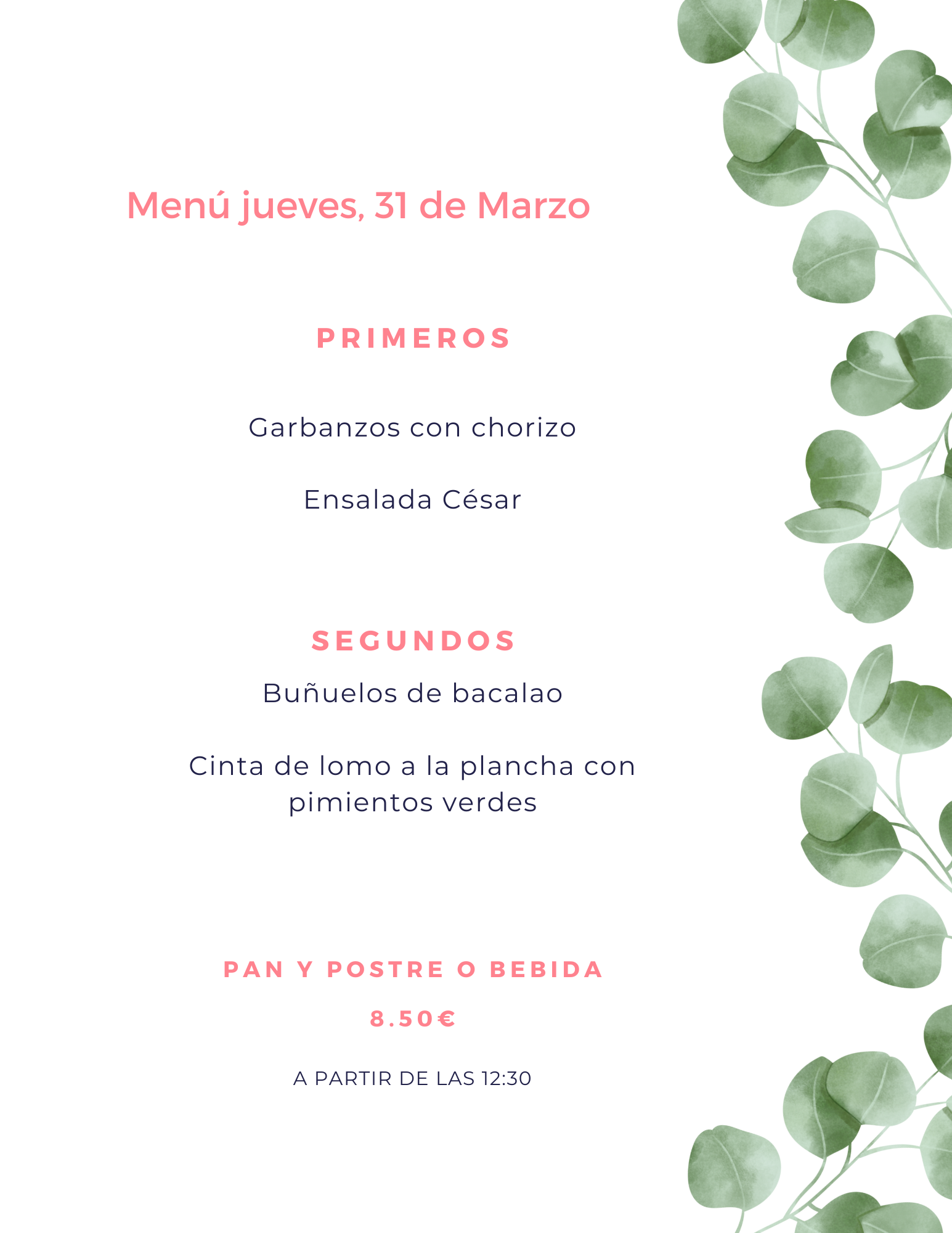 Menú jueves, 31 de Marzo marzo 30, 2022 de Tu Puchero Deja un comentario Comparte esto: Compartir en X (Se abre en una ventana nueva) X Compartir en Facebook (Se abre en una ventana nueva) Facebook Más Compartir en WhatsApp (Se abre en una ventana nueva) WhatsApp Me gusta Cargando...