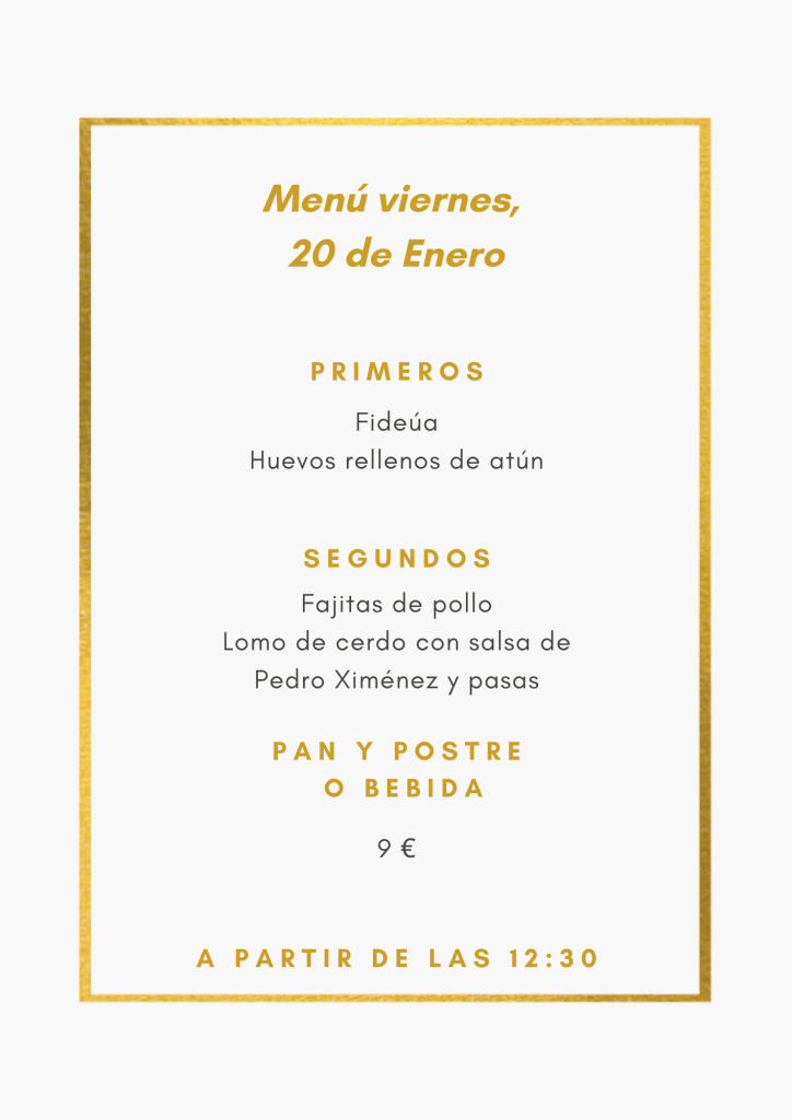 Menú viernes, 20 de Enero enero 19, 2023 de Tu Puchero Deja un comentario Comparte esto: Compartir en X (Se abre en una ventana nueva) X Compartir en Facebook (Se abre en una ventana nueva) Facebook Más Compartir en WhatsApp (Se abre en una ventana nueva) WhatsApp Me gusta Cargando...
