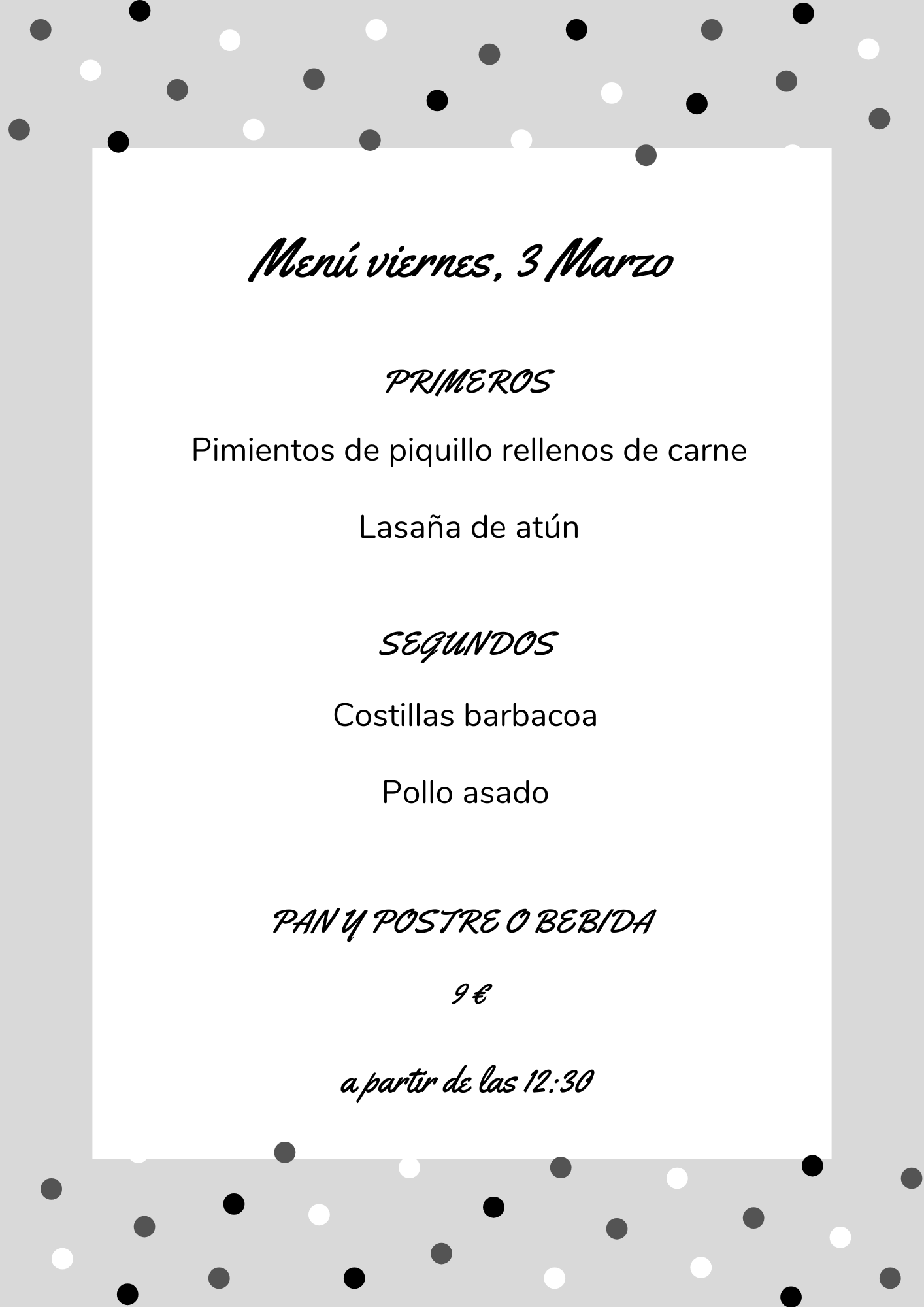 Menú viernes, 3 de Marzo marzo 2, 2023 de Tu Puchero Deja un comentario Comparte esto: Compartir en X (Se abre en una ventana nueva) X Compartir en Facebook (Se abre en una ventana nueva) Facebook Más Compartir en WhatsApp (Se abre en una ventana nueva) WhatsApp Me gusta Cargando...