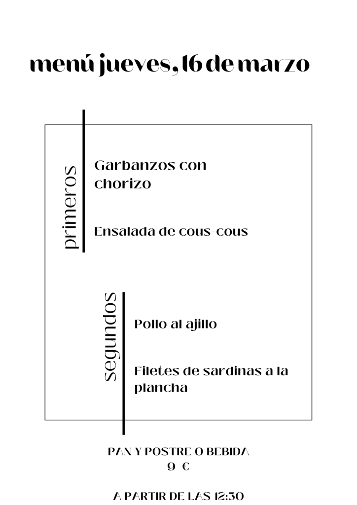 Menú jueves, 16 de Marzo marzo 15, 2023 de Tu Puchero Deja un comentario Comparte esto: Compartir en X (Se abre en una ventana nueva) X Compartir en Facebook (Se abre en una ventana nueva) Facebook Más Compartir en WhatsApp (Se abre en una ventana nueva) WhatsApp Me gusta Cargando...