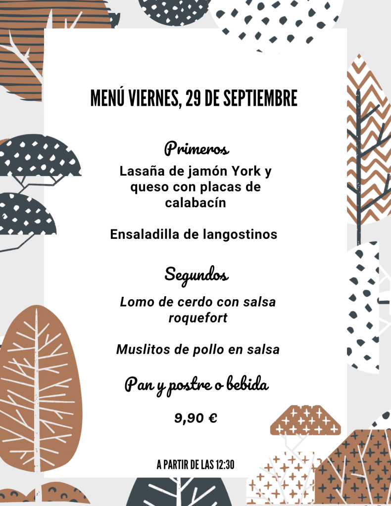 Menú viernes, 29 de Septiembre septiembre 28, 2023 de Tu Puchero Deja un comentario Comparte esto: Compartir en X (Se abre en una ventana nueva) X Compartir en Facebook (Se abre en una ventana nueva) Facebook Más Compartir en WhatsApp (Se abre en una ventana nueva) WhatsApp Me gusta Cargando...