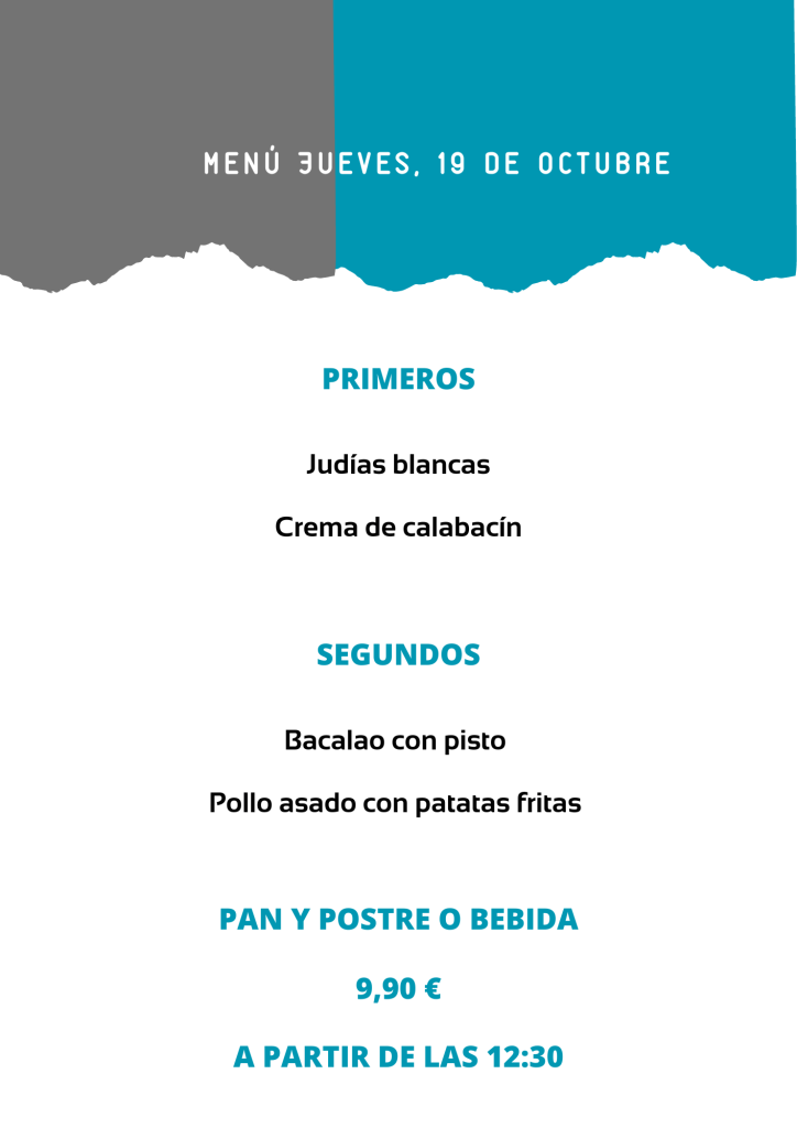 Menú jueves, 19 de Octubre octubre 18, 2023 de Tu Puchero Deja un comentario Comparte esto: Compartir en X (Se abre en una ventana nueva) X Compartir en Facebook (Se abre en una ventana nueva) Facebook Más Compartir en WhatsApp (Se abre en una ventana nueva) WhatsApp Me gusta Cargando...