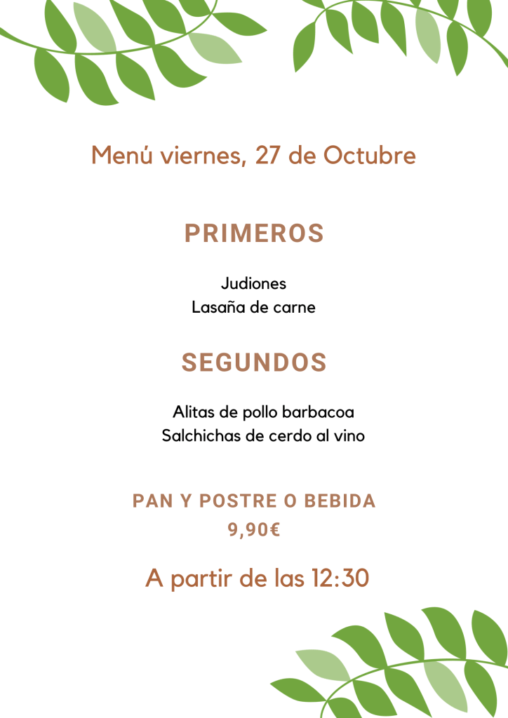 Menú viernes, 27 de Octubre octubre 26, 2023 de Tu Puchero Deja un comentario Comparte esto: Compartir en X (Se abre en una ventana nueva) X Compartir en Facebook (Se abre en una ventana nueva) Facebook Más Compartir en WhatsApp (Se abre en una ventana nueva) WhatsApp Me gusta Cargando...