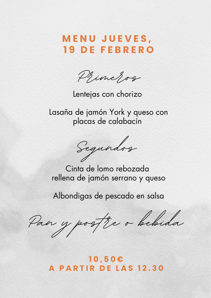 Menú jueves, 19 de Febrero febrero 18, 2026 de Tu Puchero Deja un comentario Comparte esto: Compartir en X (Se abre en una ventana nueva) X Comparte en Facebook (Se abre en una ventana nueva) Facebook Más Compartir en WhatsApp (Se abre en una ventana nueva) WhatsApp Me gusta Cargando...
