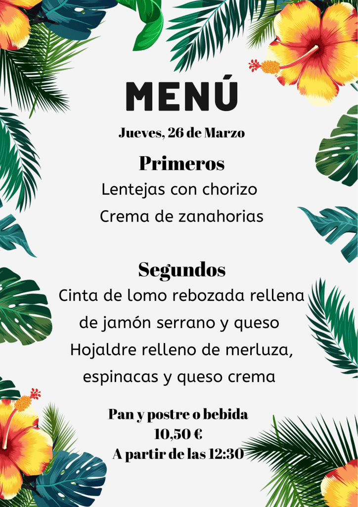 Menú jueves, 26 de Marzo marzo 25, 2026 de Tu Puchero Deja un comentario Comparte esto: Compartir en X (Se abre en una ventana nueva) X Comparte en Facebook (Se abre en una ventana nueva) Facebook Más Compartir en WhatsApp (Se abre en una ventana nueva) WhatsApp Me gusta Cargando...