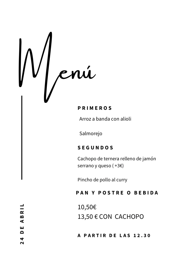 Menú viernes, 24 de Abril abril 23, 2026 de Tu Puchero Deja un comentario Comparte esto: Compartir en X (Se abre en una ventana nueva) X Comparte en Facebook (Se abre en una ventana nueva) Facebook Más Compartir en WhatsApp (Se abre en una ventana nueva) WhatsApp Me gusta Cargando...