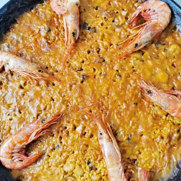 Ingredientes: arroz, pollo, gambas, mejillones, calamar, gambón, judías verdes, tomate, aceite de oliva, ajo, azafrán, pimentón.
