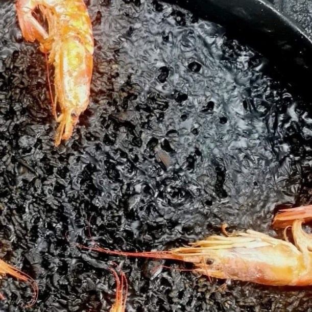 Ingredientes: arroz, gambas, mejillones, calamar, pescado, gambón, cigala, fumet de pescado, tomate, tinta de calamar, aceite de oliva, ajo, azafrán, pimentón.